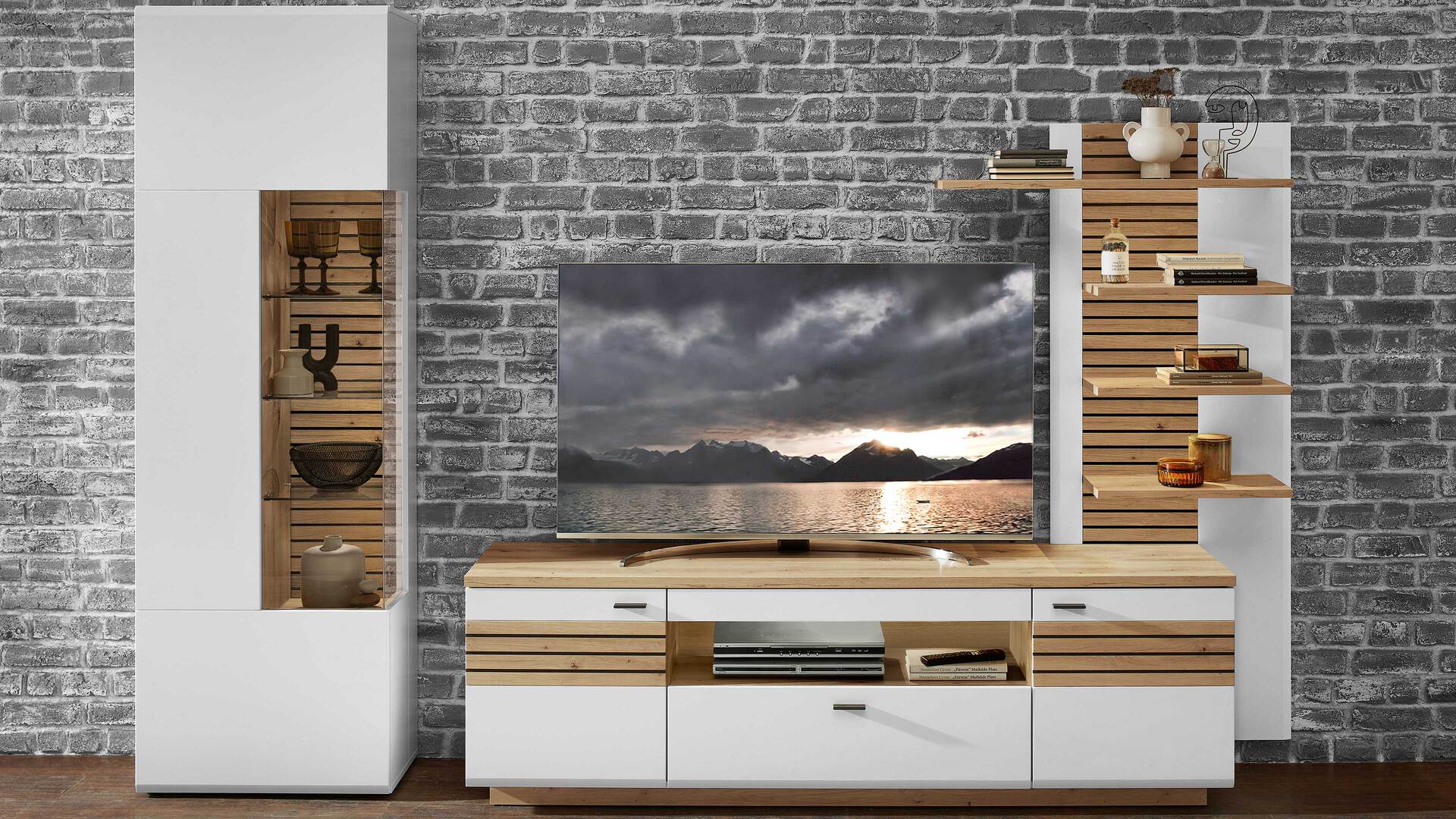 Diese Anbauwand kombiniert modernes Design mit funktionaler Aufteilung und bringt Stil und Ordnung in Ihr Wohnzimmer.