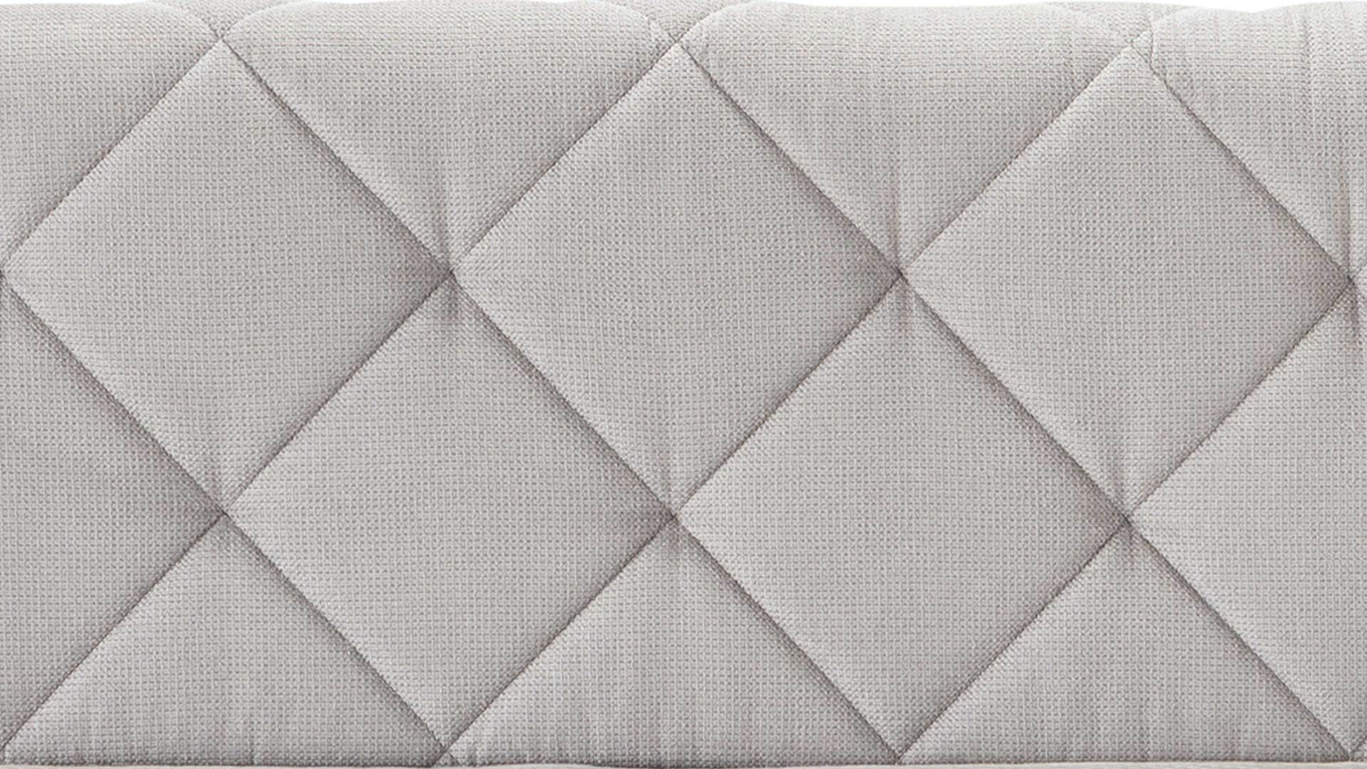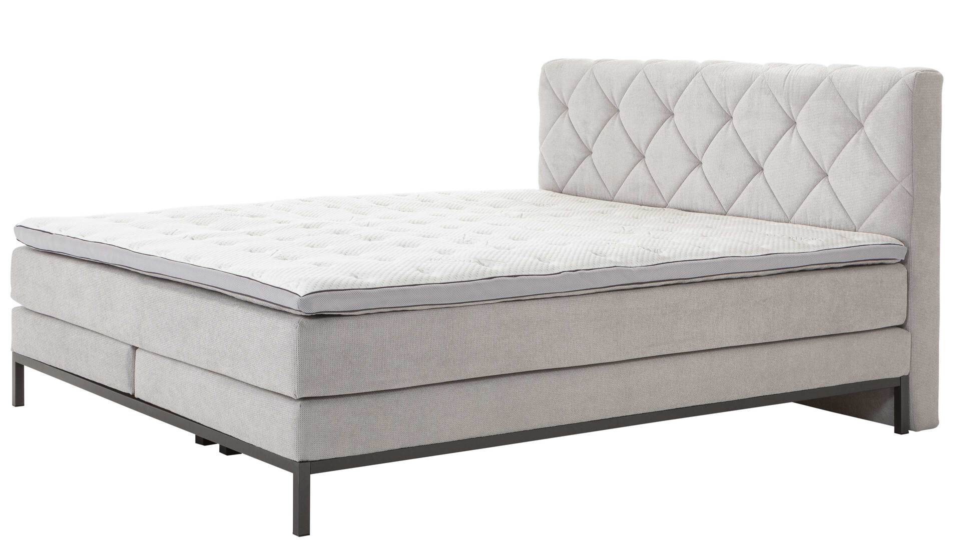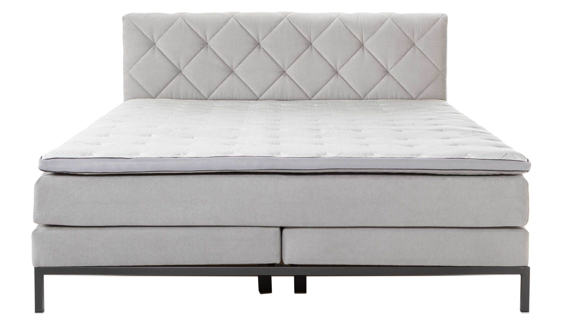 Das hochwertige Boxspringbett Rockaway kombiniert einen silbergrauen Stoffbezug mit einem Fußgestell aus dunkelgrau pulverbeschichtetem Metall. Es strahlt moderne Eleganz aus. Ein optisches Highlight bildet das Polsterkopfteil mit den markanten Heftungen und der Rautensteppung. Die Rückseite ist mit Spinnvlies bezogen.