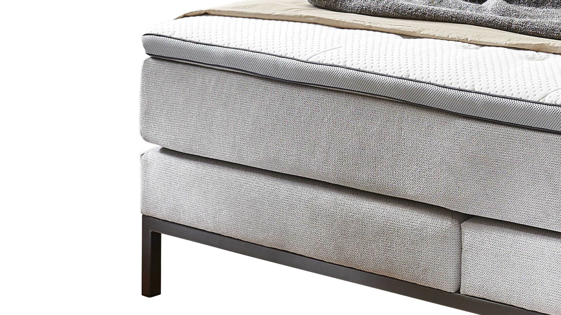 Als Basis fungieren zwei Boxen mit Taschenfederkernpolsterung und Metallrahmen-Untergestell. Sie sind jeweils rundum mit Möbelstoff bezogen und schaffen mit dem Mini-Taschenfederkern exzellente Voraussetzungen für ein angenehmes Liegegefühl und hohen Schlafkomfort.