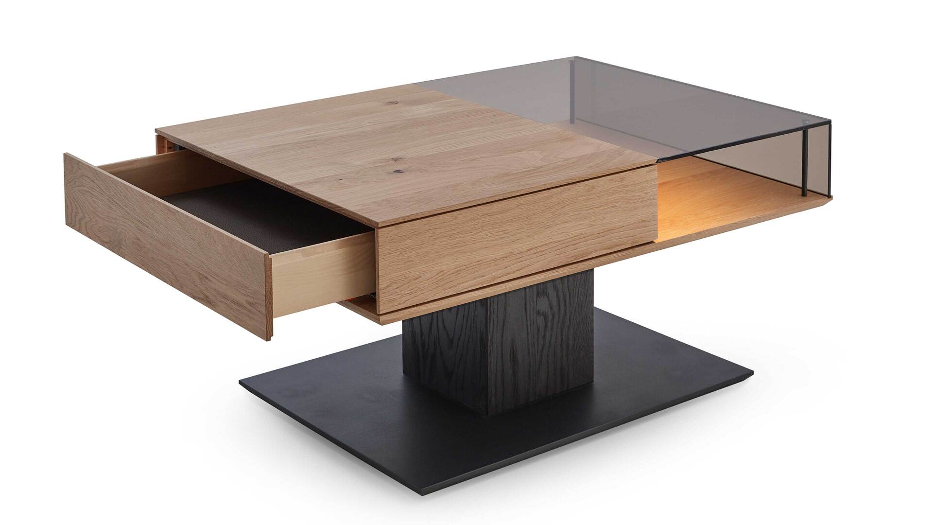 massive Kernesche Tischplatte mit Eiche Spaltholzapplikationen und parsol bronzefarbiger Glasablage