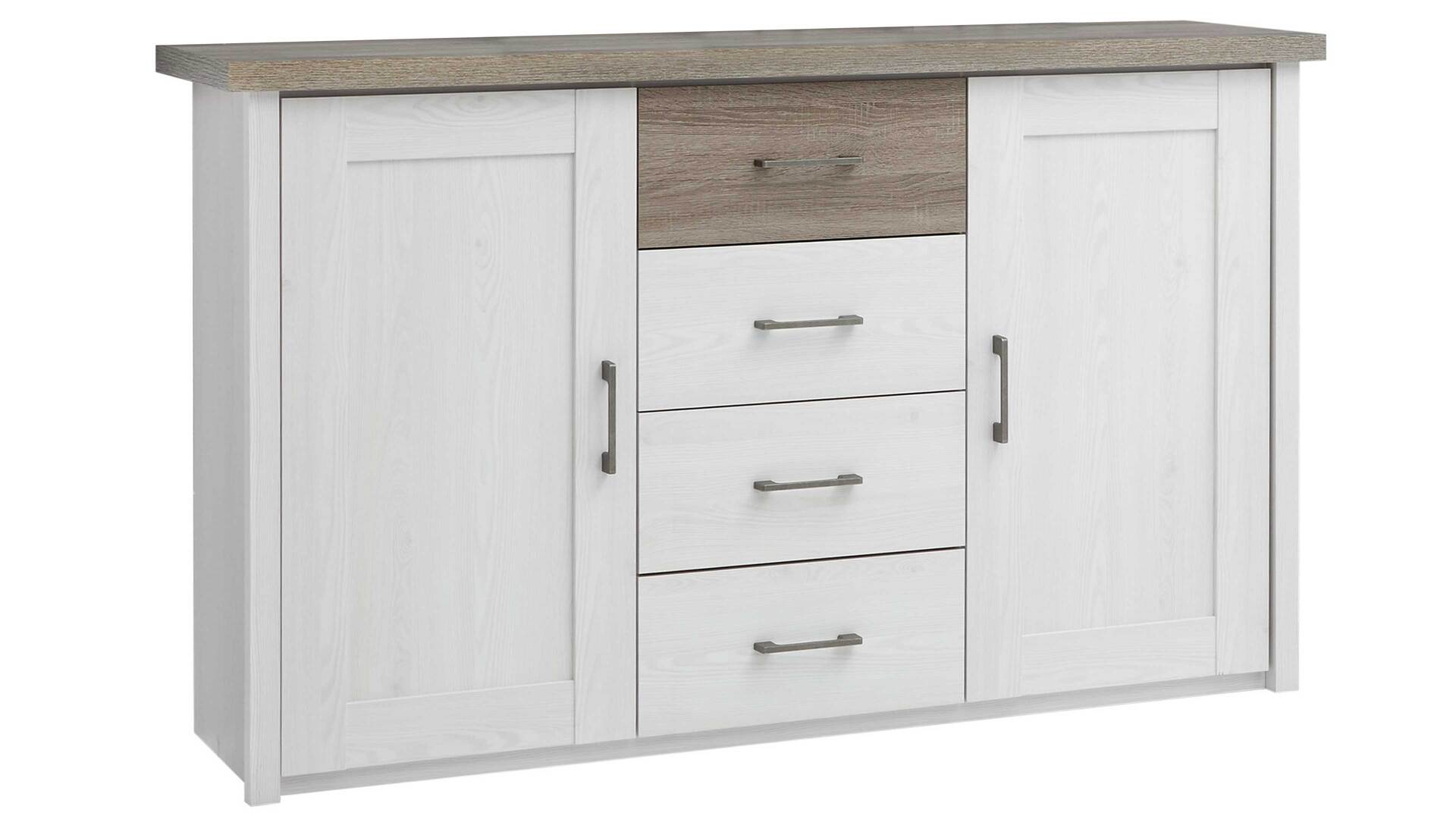 Diese ansprechende Kombikommode wertet Ihr Schlafzimmer optisch wie funktional auf. Sie begeistert mit ihrem klassisch-eleganten Design, das Landhaus-Flair gepaart mit antikem Charme mit sich bringt. Zu weiten Teilen präsentiert sich der Schrank in weißer Pinien-Nachbildung. Akzentuierend wirken die trüffelfarbenen Details und die dunklen Griffe. Sie verleihen der prinzipiell hell gestalteten Kommode eine attraktive Tiefgründigkeit. Neben den visuellen Vorzügen bieten die erstklassig verarbeiteten Kunststoffoberflächen auch einen funktionalen Vorteil: Sie sind angenehm pflegeleicht.