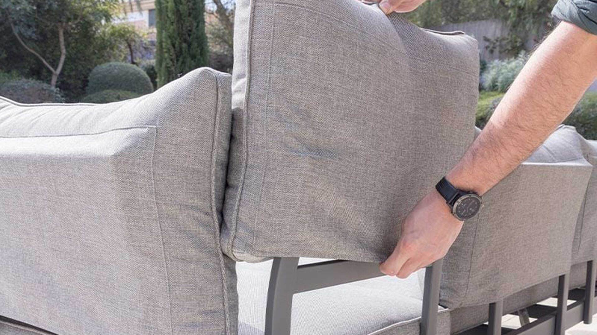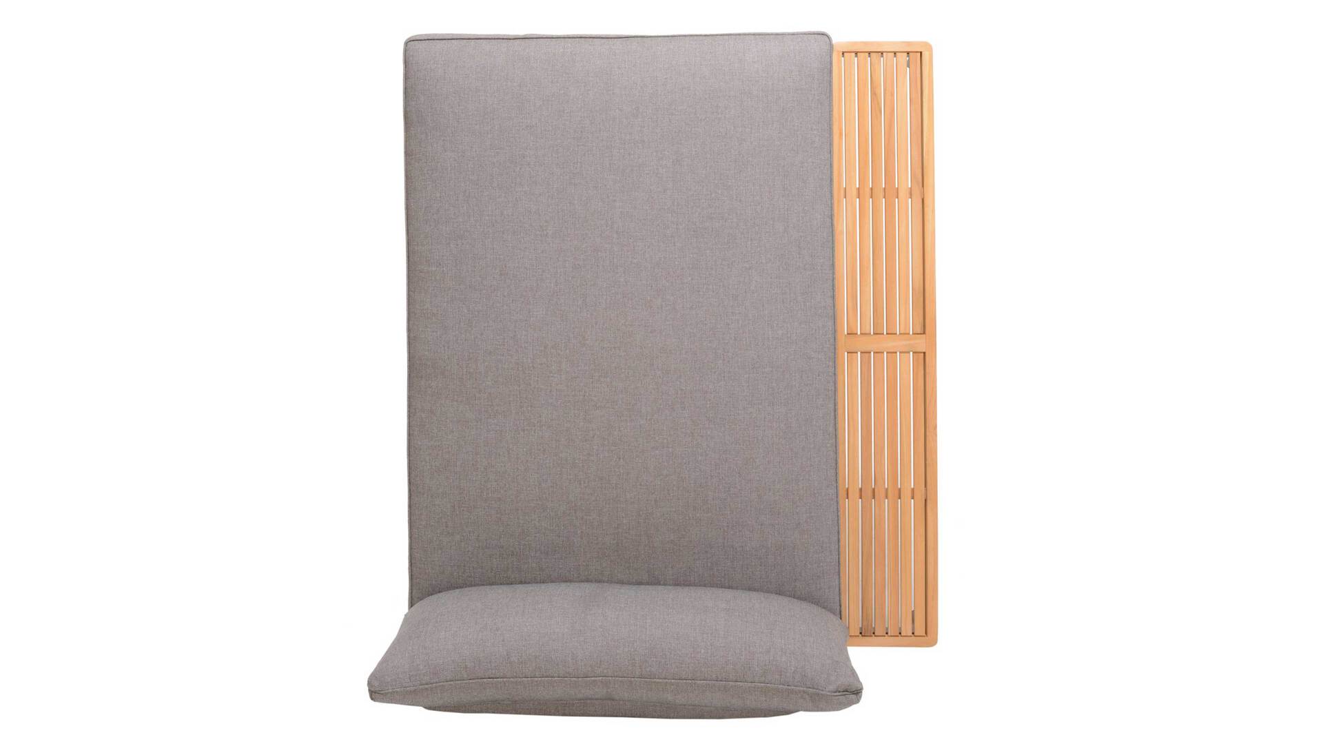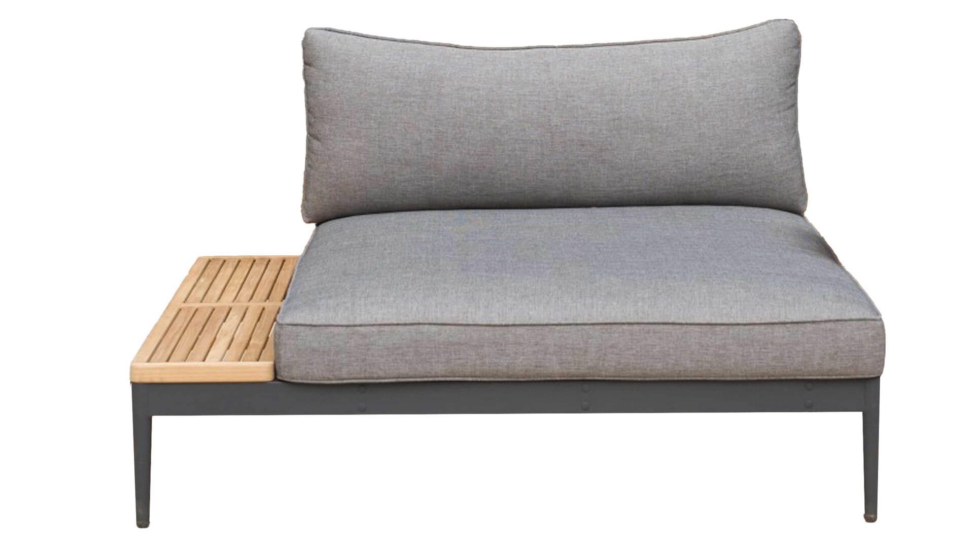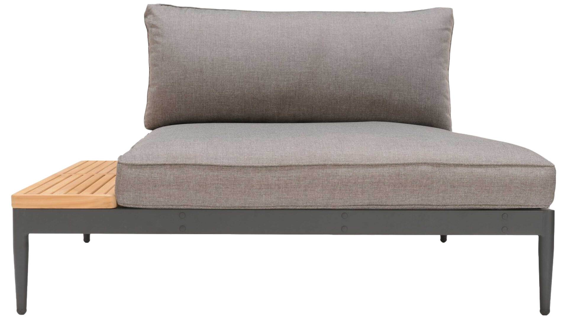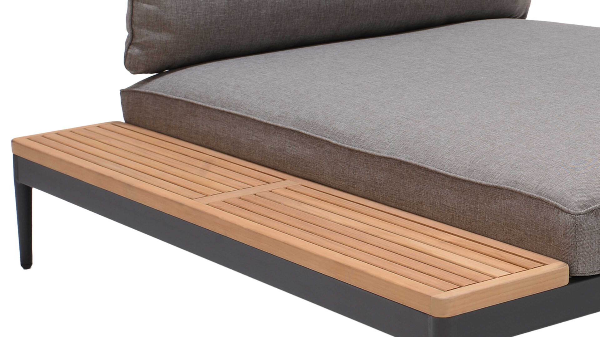 die Lehne für das Seitenkissen lässt sich rechts oder links montieren, so dass sich die geschliffene Teakholzablage sich ebenfalls rechts oder links nutzen lässt