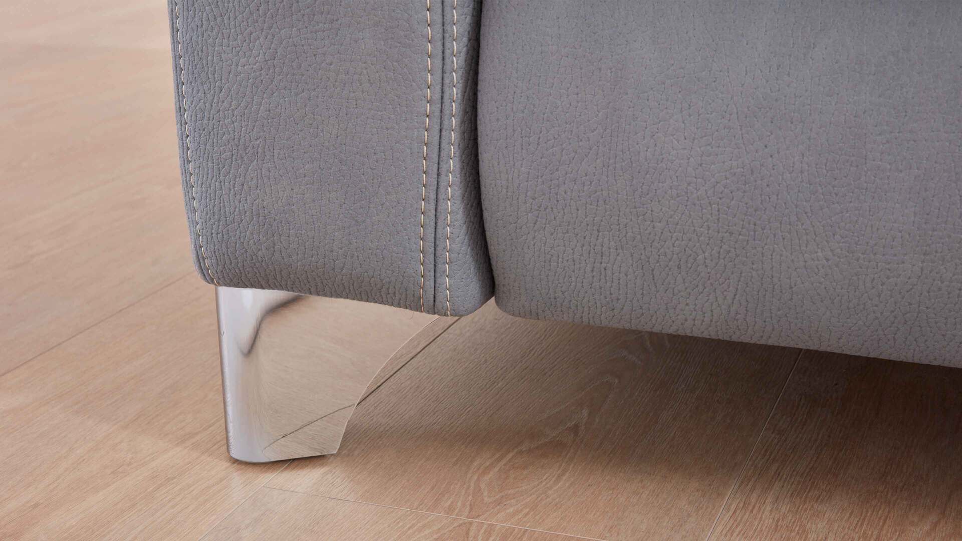 Durch die schlichten Farben fügt es sich in verschiedene Einrichtungen absolut stimmig ein. Als visuelles Highlight fungiert der helle, stahlfarbene Mikrofaserbezug, dessen genarbte, lederähnliche Optik ebenso einen edlen Akzent setzt wie die beige Kontrastnaht. Die glänzenden Metall-Winkelfüße runden das trendige Design stilsicher ab. Da auch die Rückseiten stoffbezogen sind, können Sie die Couch frei im Raum platzieren.