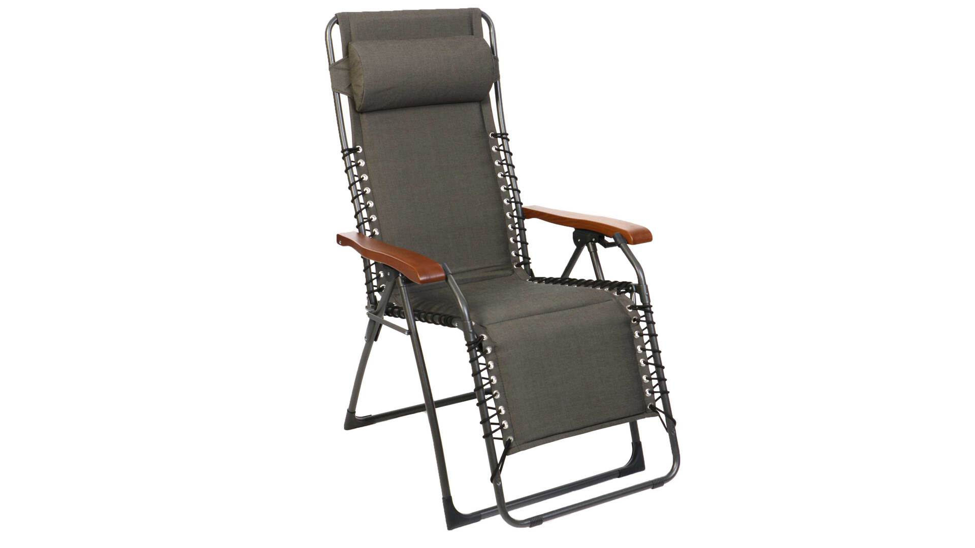 dunkelgauer Olefinbezug, Walnuss-Nachbildung und anthrazitfarben pulverbeschichtetes Aluminium